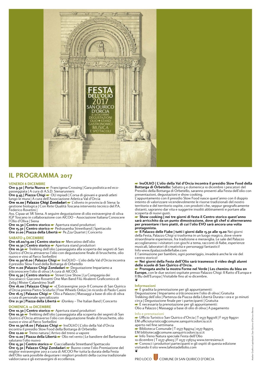 Sarà un’edizione speciale, la numero venticinque, ricca di eventi, appuntamenti, novità e momenti di approfondimento. Un’idea lungimirante quella che nacque a San Quirico nel 1993, ovvero, creare un evento dedicato all’olio extravergine d’oliva. Da allora è cresciuta la qualità media e sono cresciute le aziende produttrici, in un territorio già particolarmente vocato. Il centro storico della cittadina valdorciana vivrà un’esplosione di sapori, profumi e folclore popolare, un’occasione unica per visitare le bellezze artistiche ed architettoniche ed i paesaggi famosi nel mondo, nonché per degustare la nuovissima annata dell’olio extravergine. Il premio Extravergine 2017 guarda al sociale e verrà assegnato a Pietro Scidurlo, che ha percorso in handbike tutta la Via Francigena. Ma la Festa dell’olio sarà già un momento per respirare l’aria natalizia nelle vie e nelle piazze medievali di San Quirico; mentre le sale rinascimentali di Palazzo Chigi saranno già avvolte nella magia del Palazzo delle Fiabe, con racconti, intrattenimento e giochi a tema.
